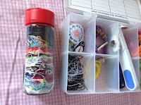 Eu vou acumulando ali na caixinha, se houver espaço vazio guardo o canto inferior esquerdo, as pontinhas e depois ao fim do dia ou de alguns dias se não tiver muitas, passo para o frasco... a minha toalha está bem destacada com uma imensidão de preto e verde...alguns apontamentos de azul no meio que foi de desmanchar os desenhos que estavam já antigos feitos na toalha e eu não gostava!